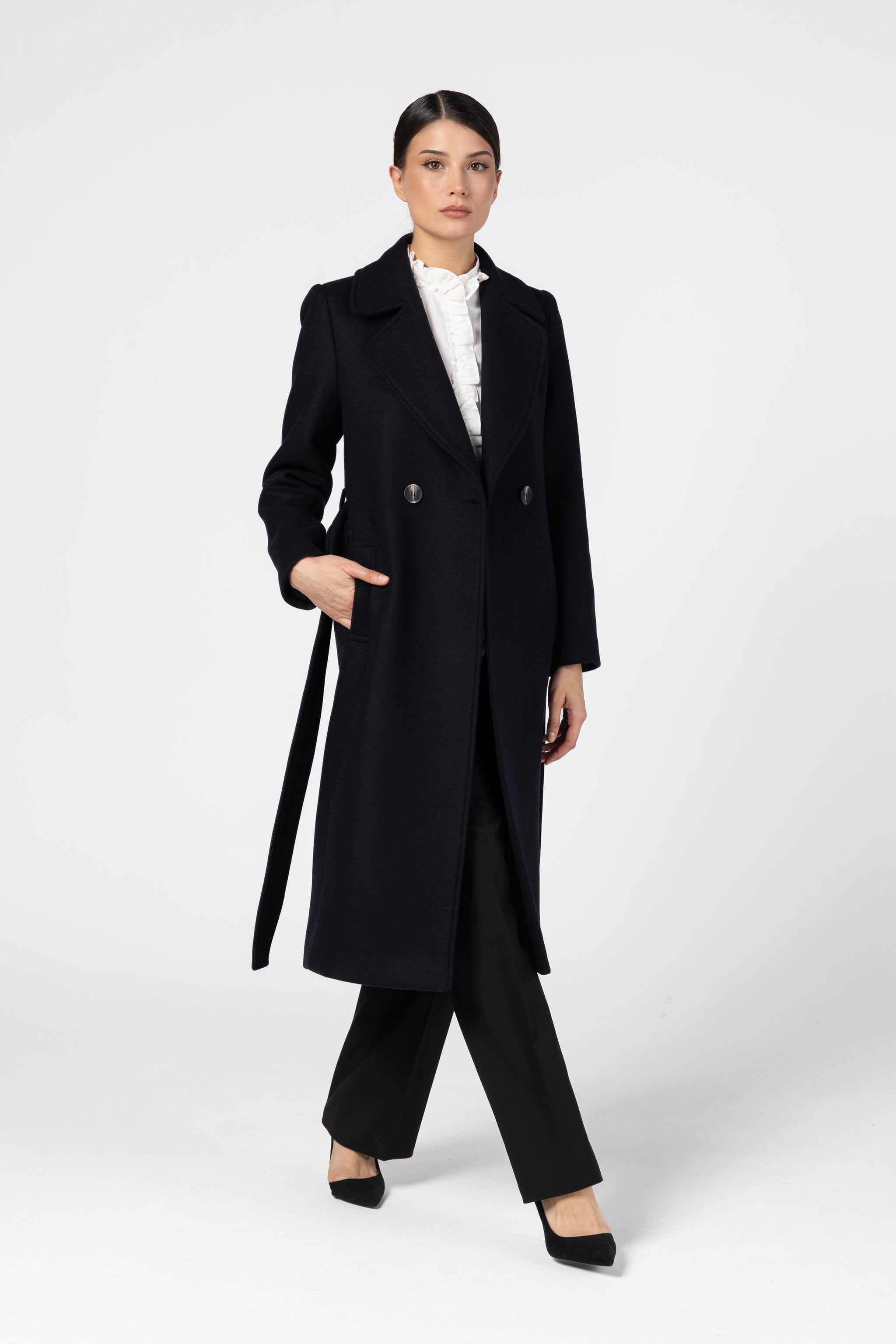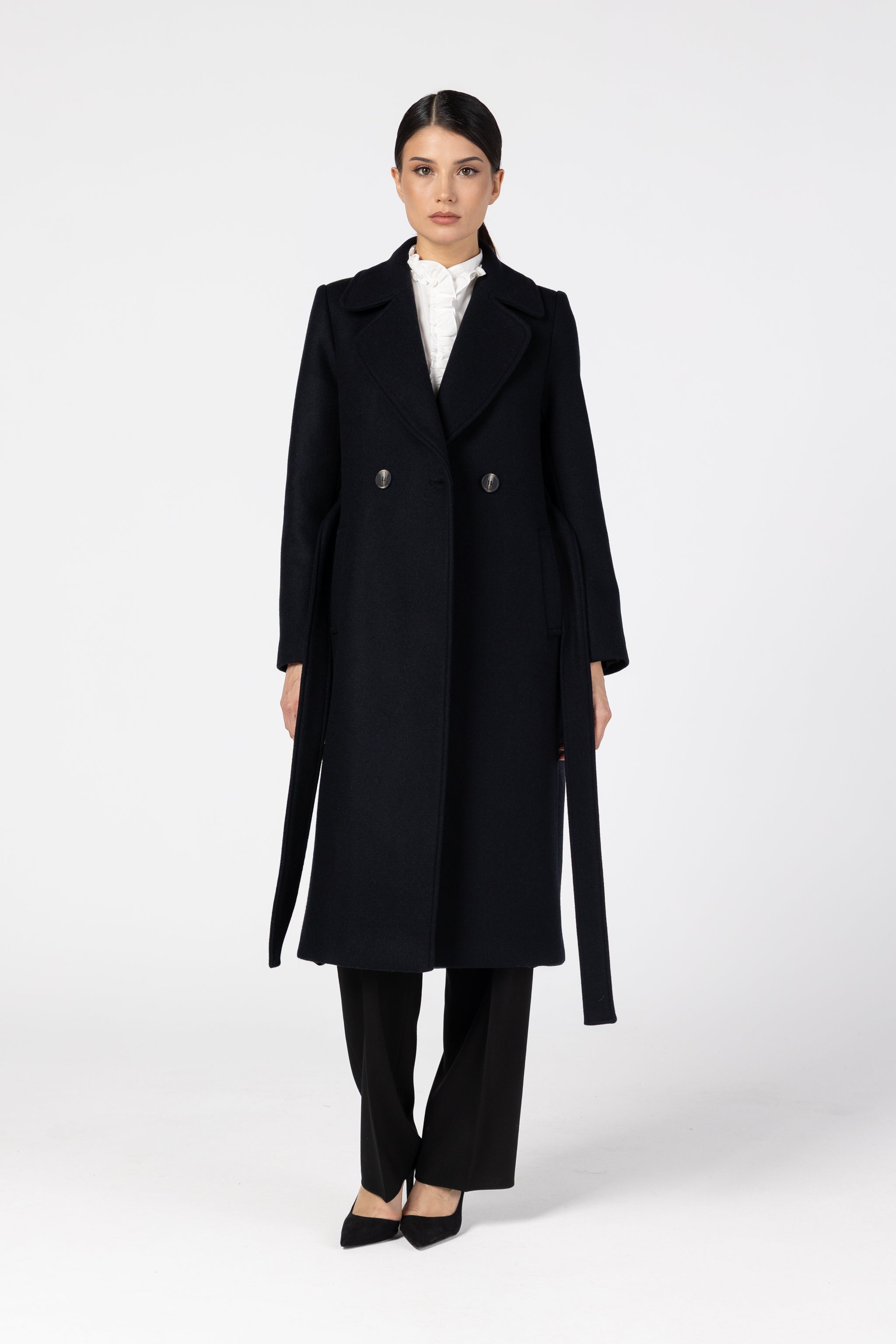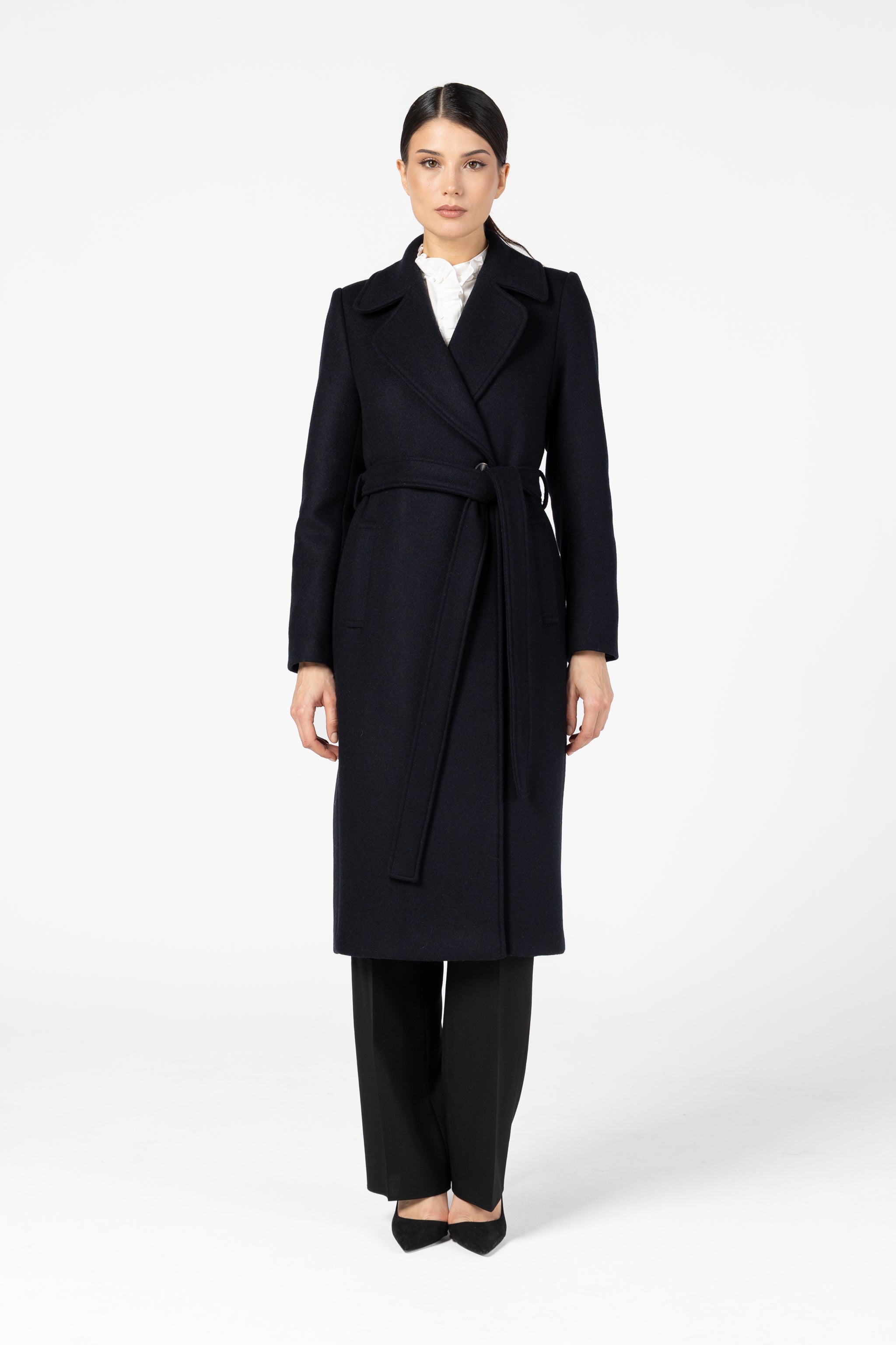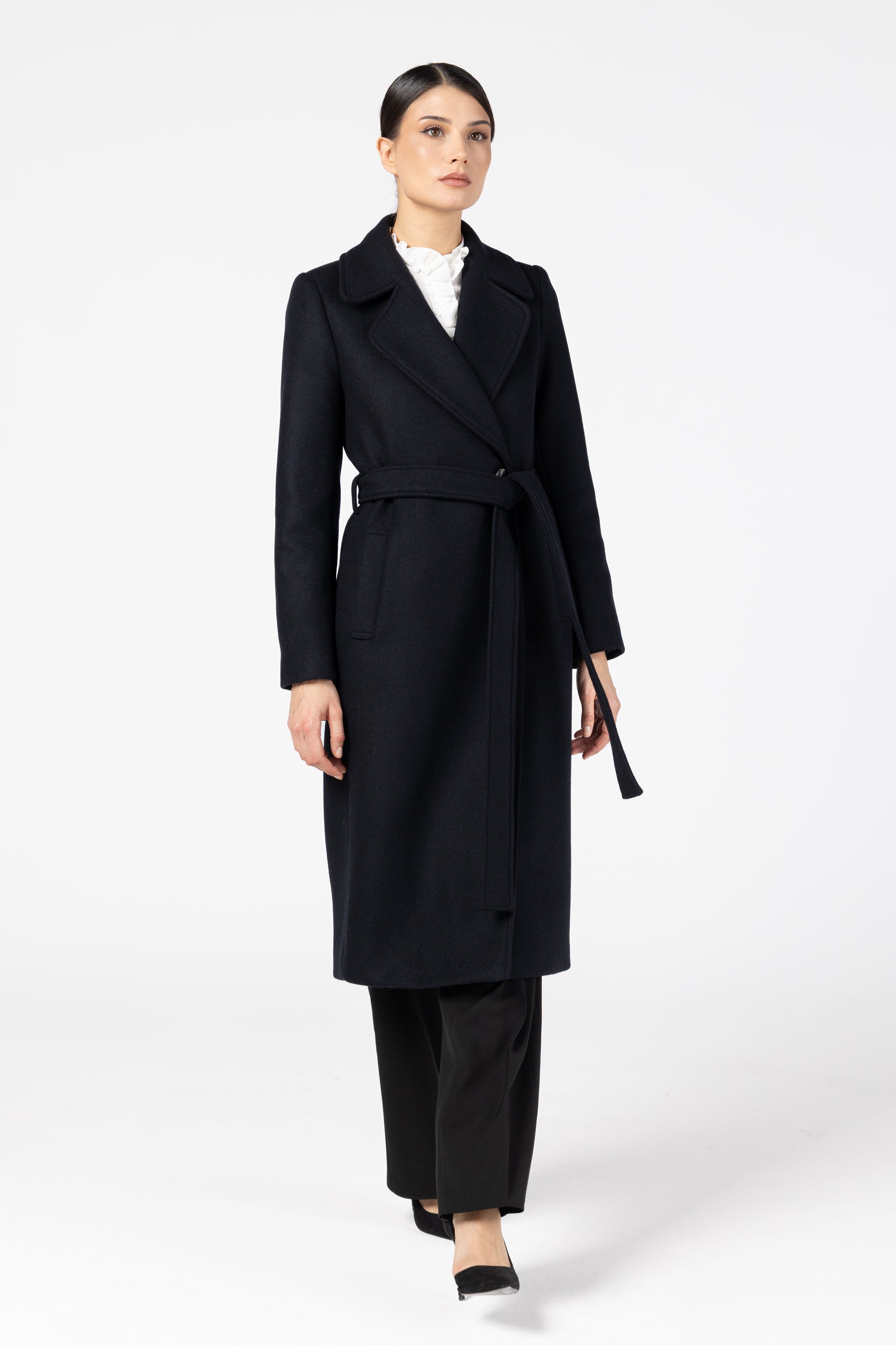 Căptușeala din 100% vâscoză asigură confort și lejeritate, iar croiala clasică, cu revere elegante și cordon în talie, subliniază grațios silueta. Linia curată, detaliile fine și nuanța profundă de bleumarin transformă acest palton într-o piesă versatilă, ușor de integrat în ținute office, casual sau elegante.