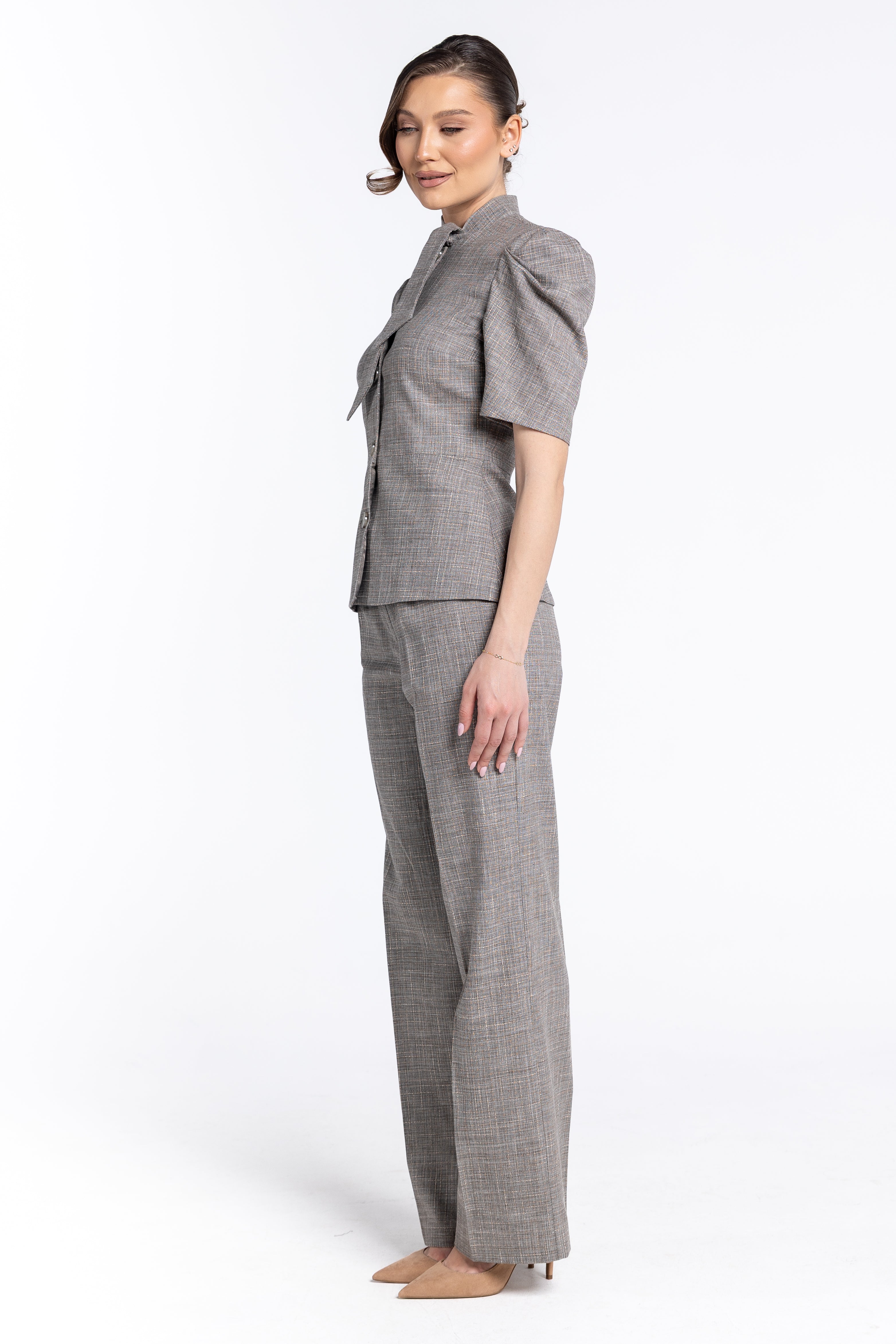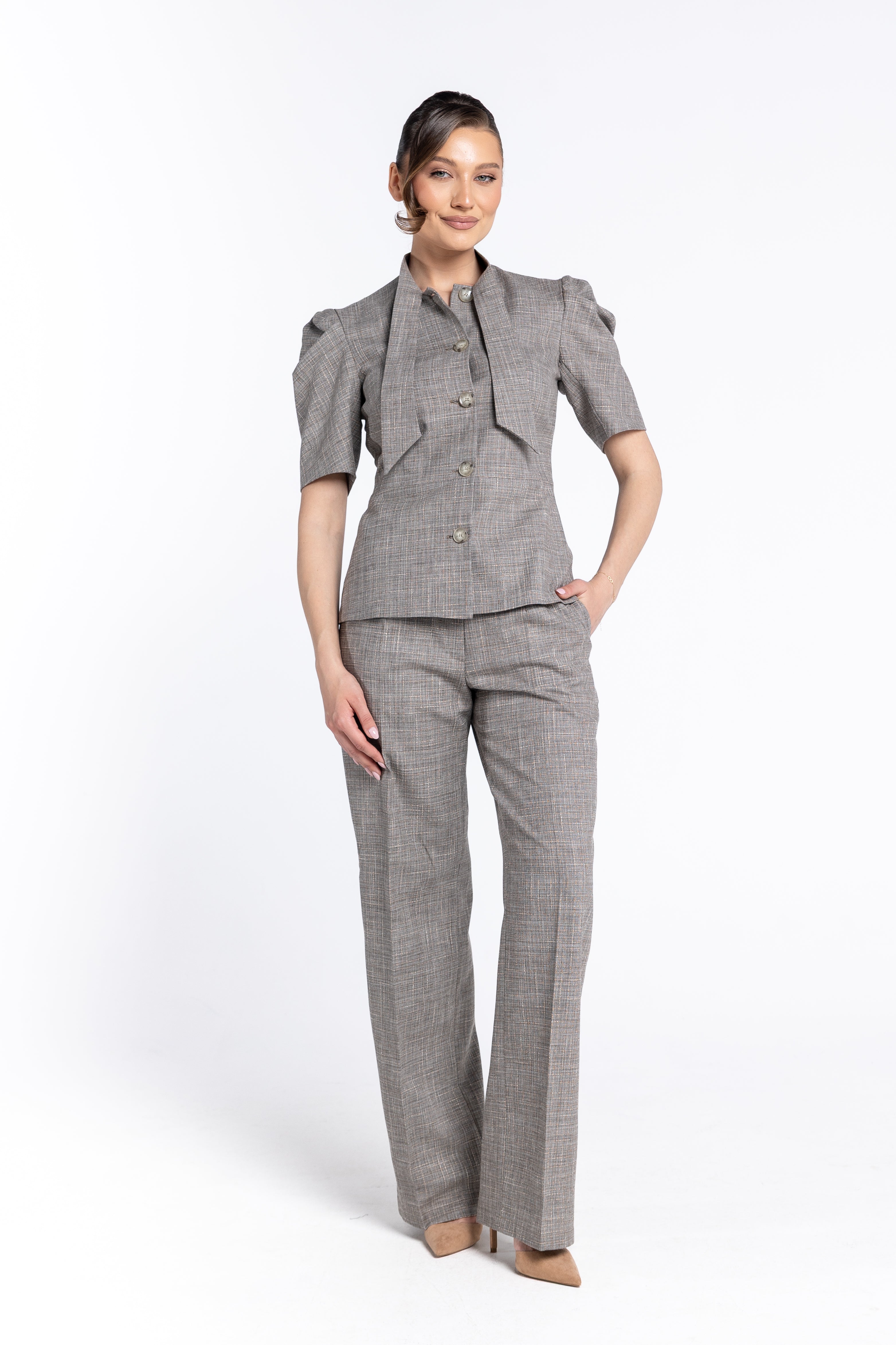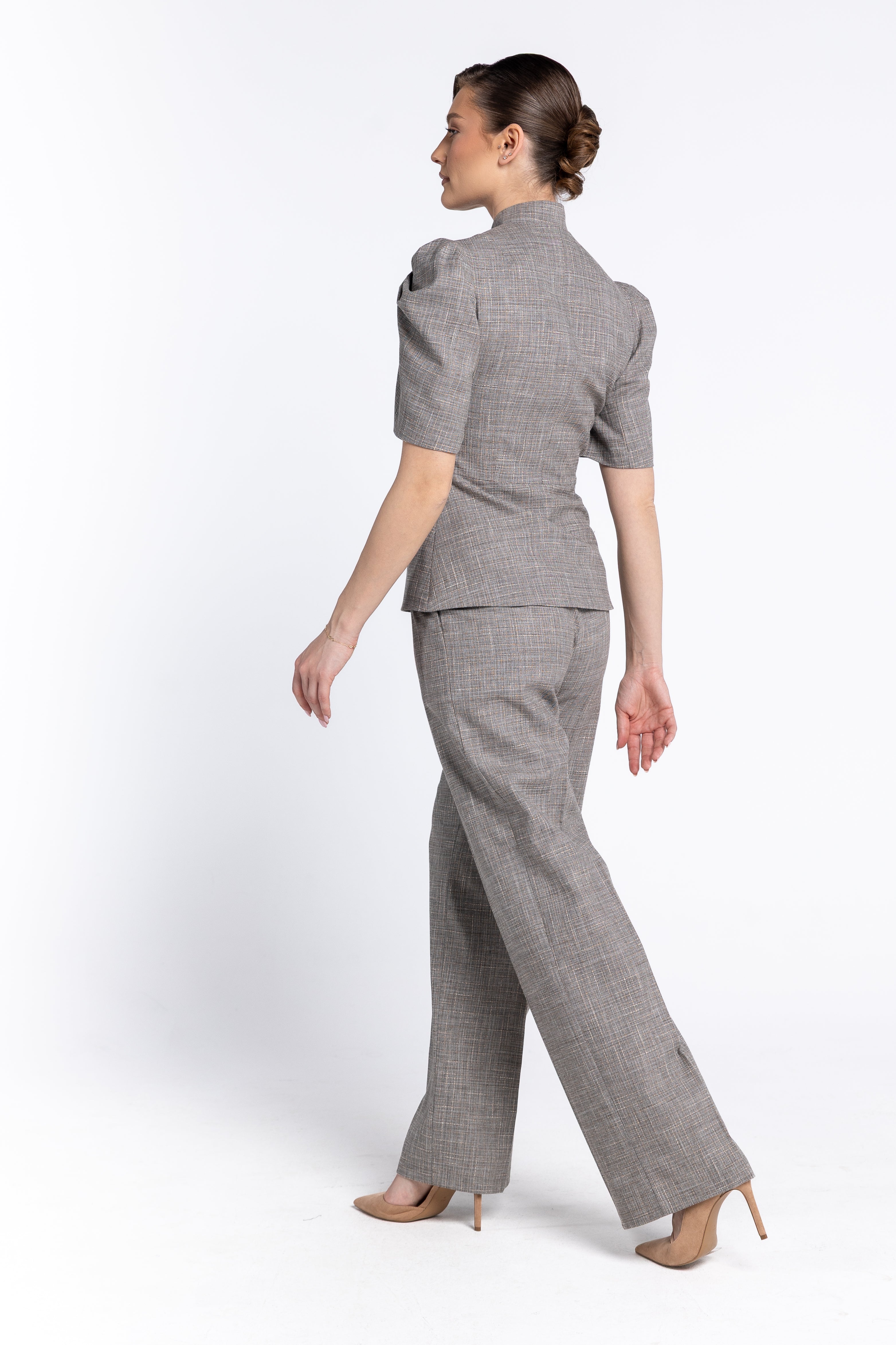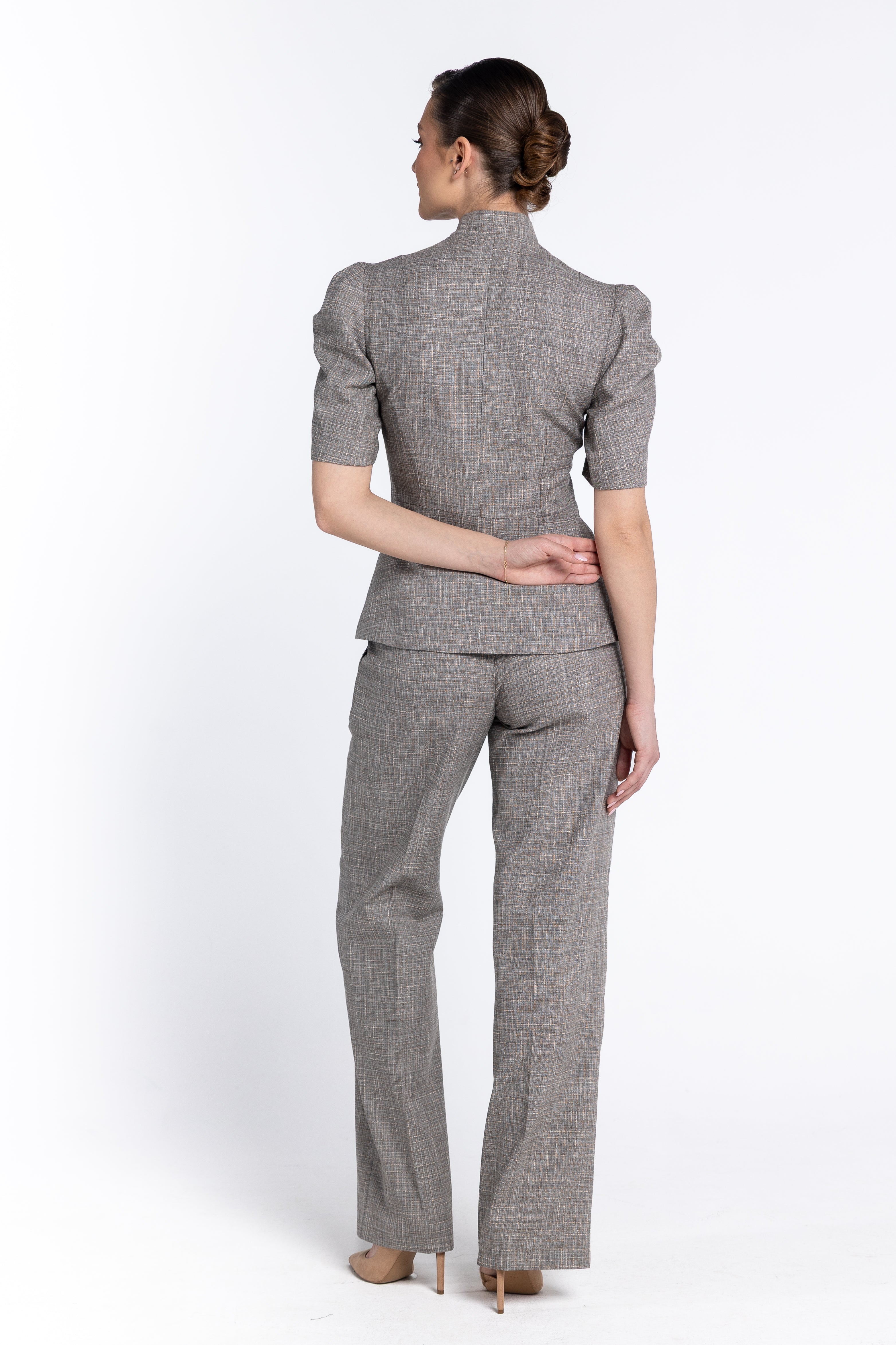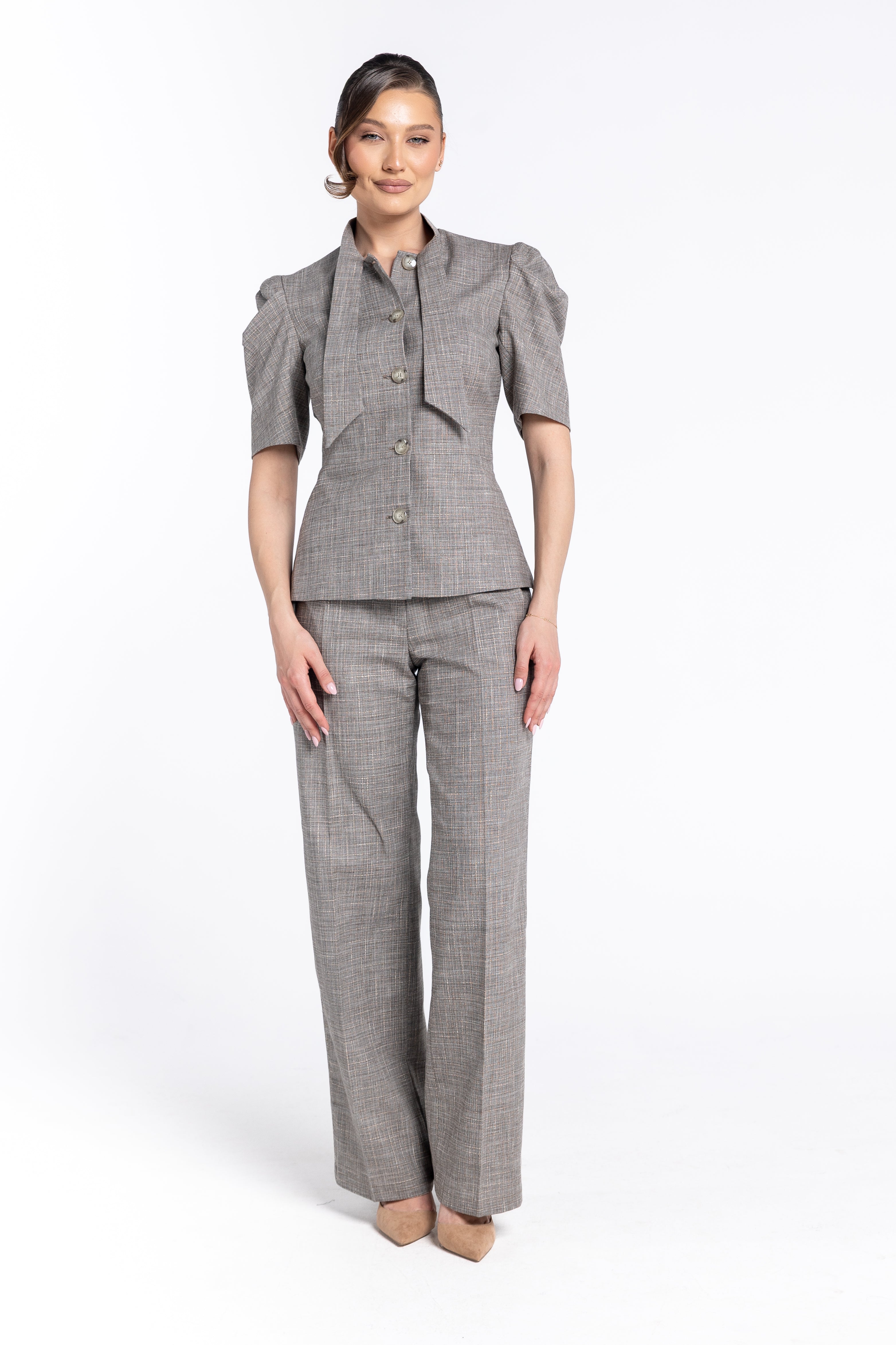 Eleganța verii este definită prin acest costum din două piese, o interpretare modernă și feminină a stilului office-chic. Realizat dintr-un amestec echilibrat de in și bumbac, acest set într-o nuanță versatilă de grej/maro melanj oferă o textură prețioasă și un confort termic de neegalat pentru zilele calde.