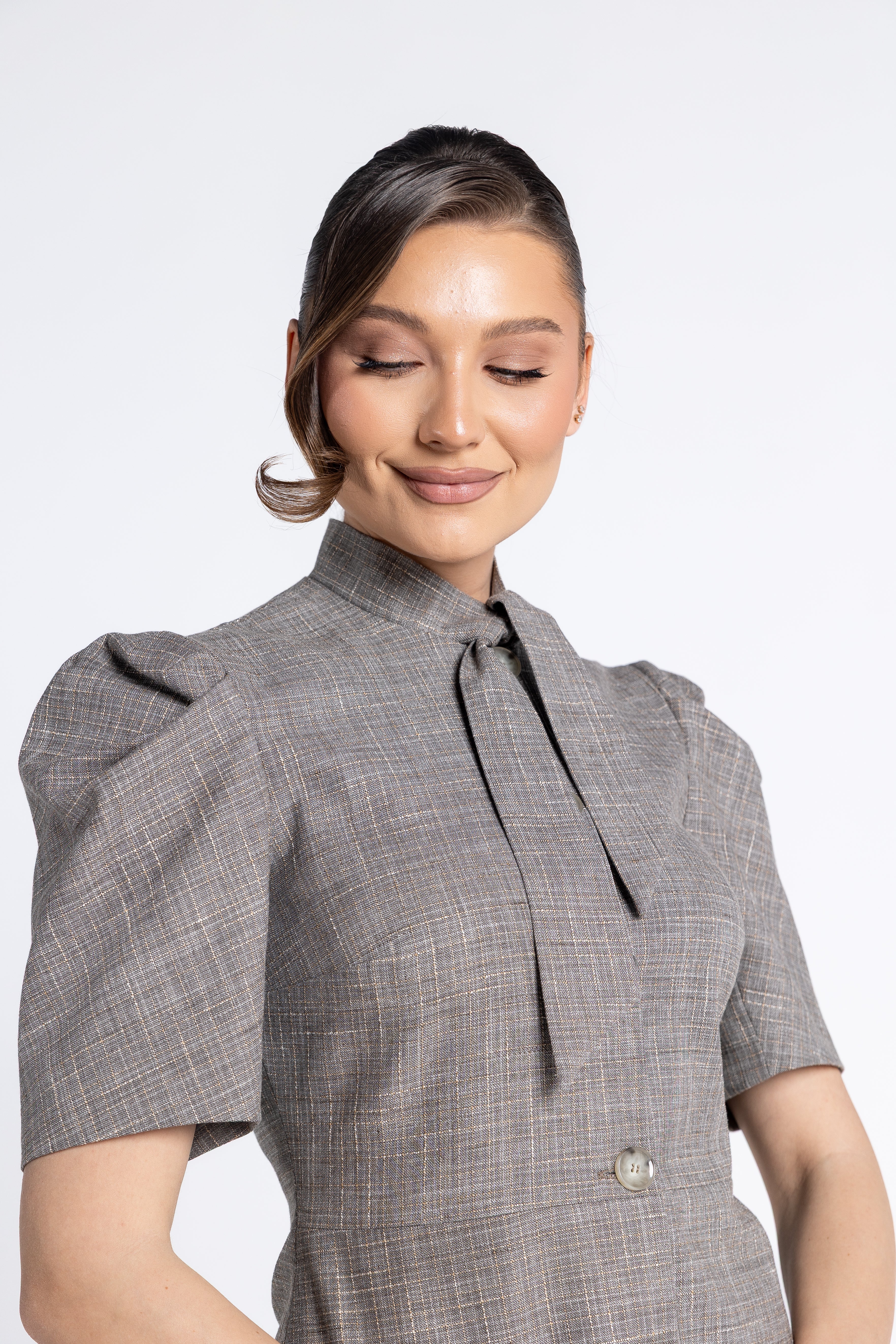 Mâneci scurte, cu volum la umeri (tip bufant), care oferă o alură sculpturală și puternică.