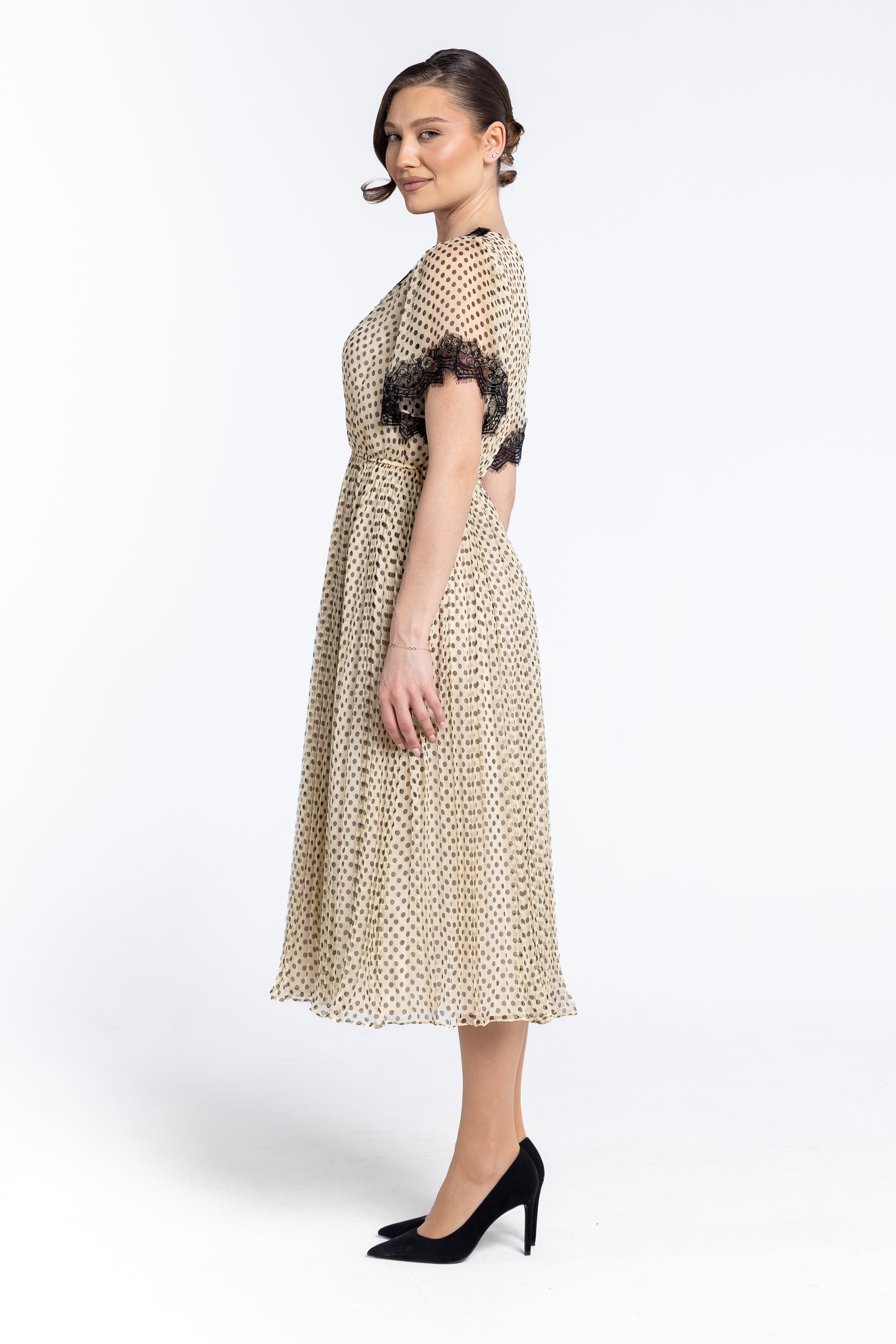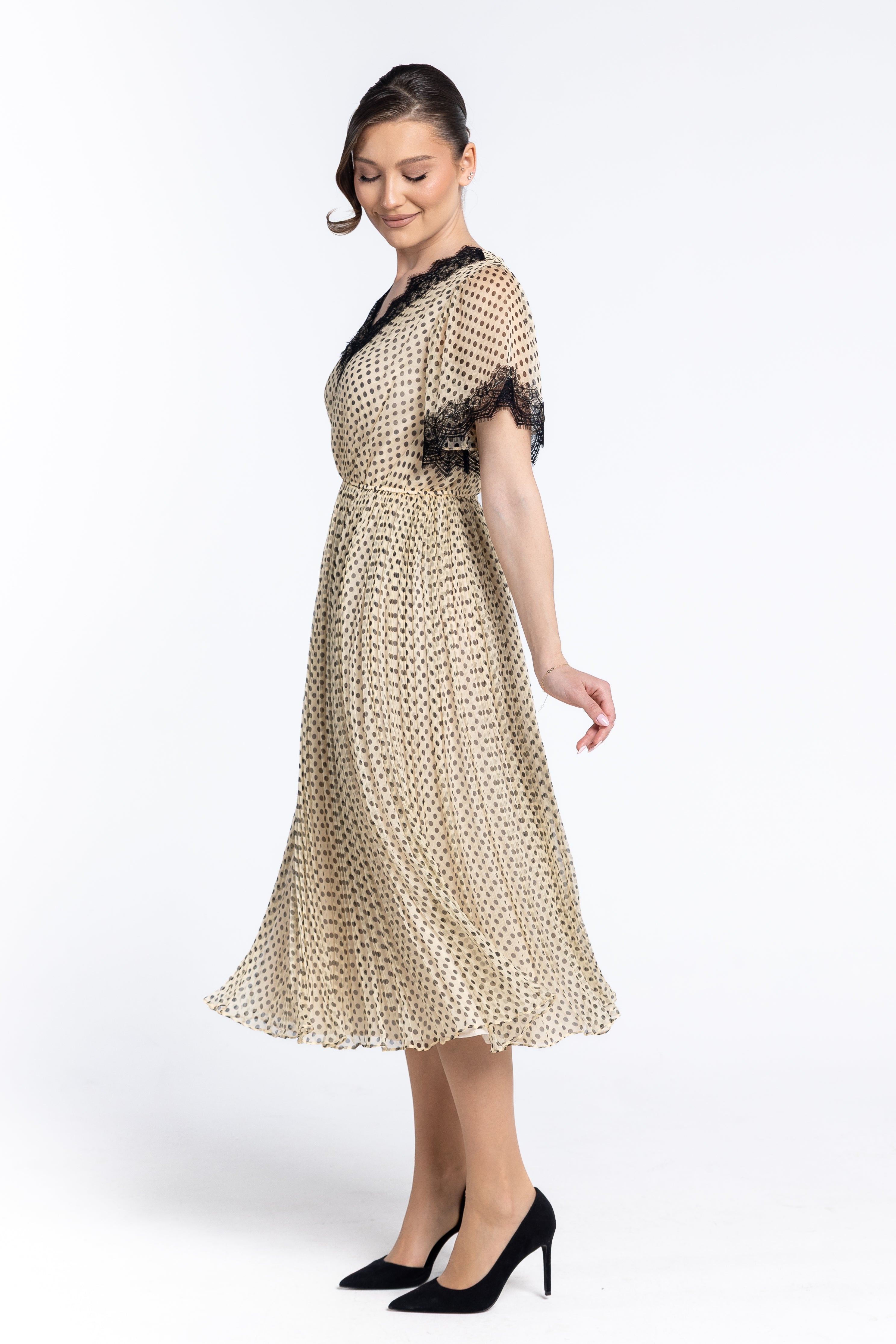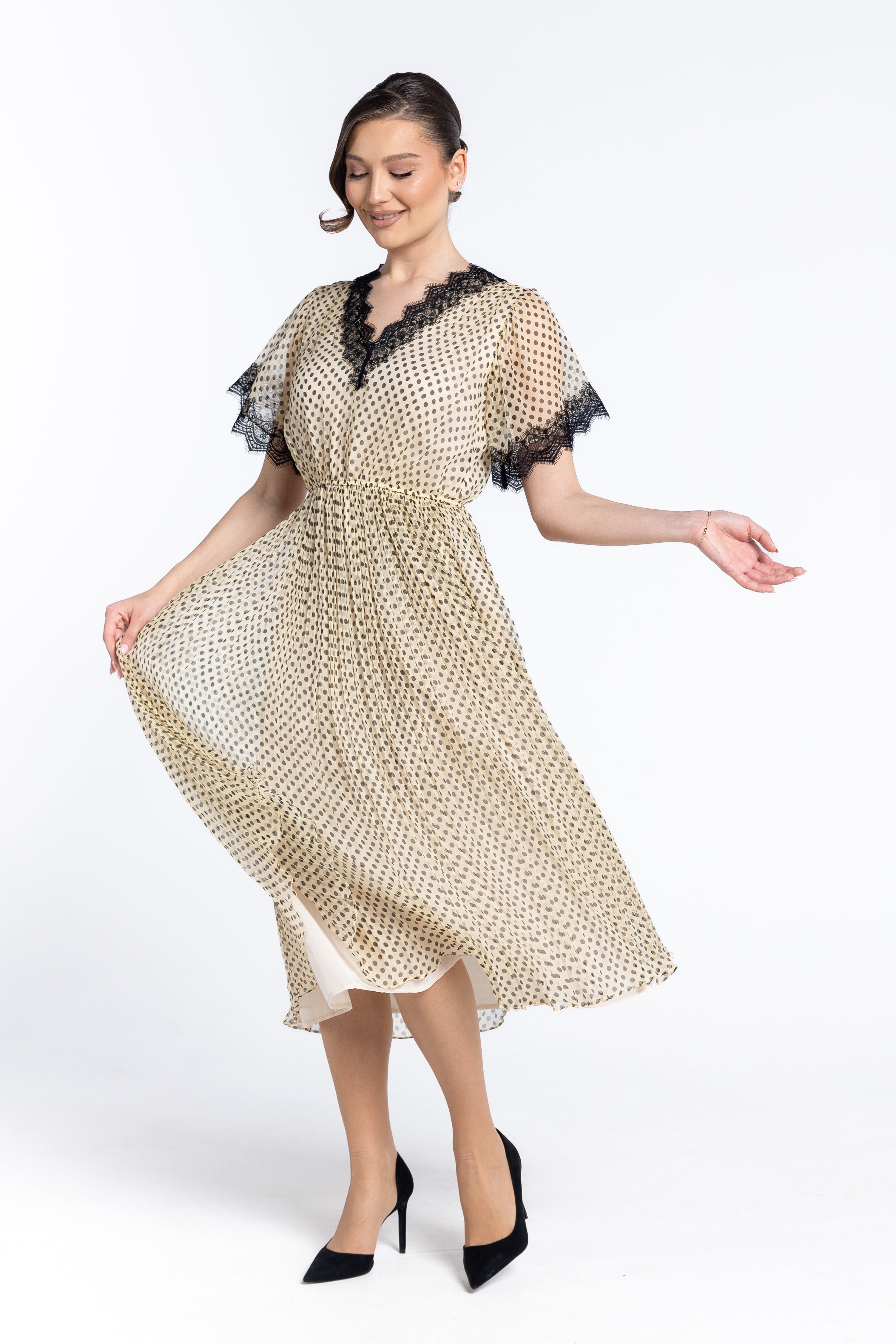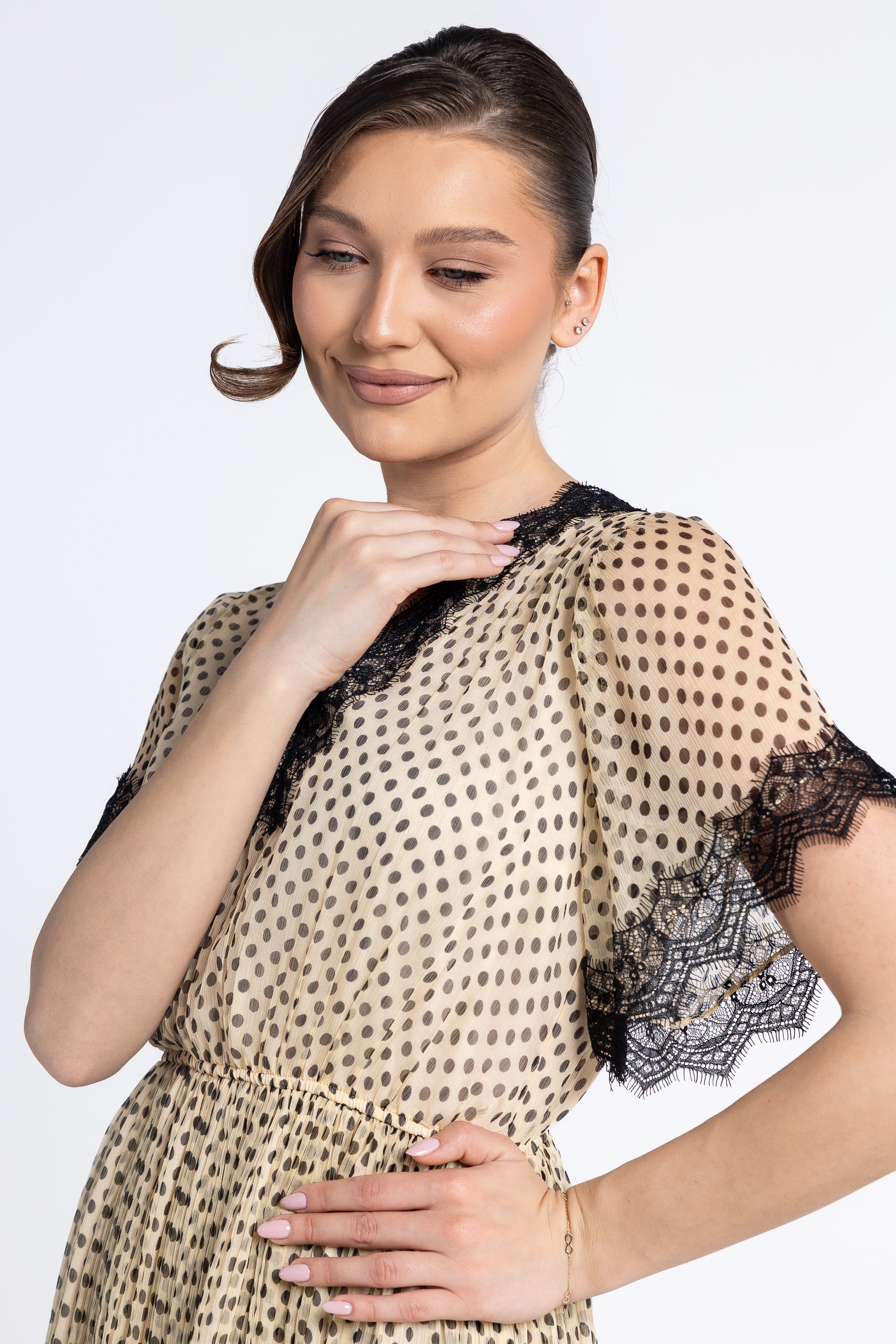 Un joc delicat de buline negre pe un fond crem/nude, oferind o estetică versatilă, potrivită atât pentru evenimente de zi, cât și pentru ocazii speciale.