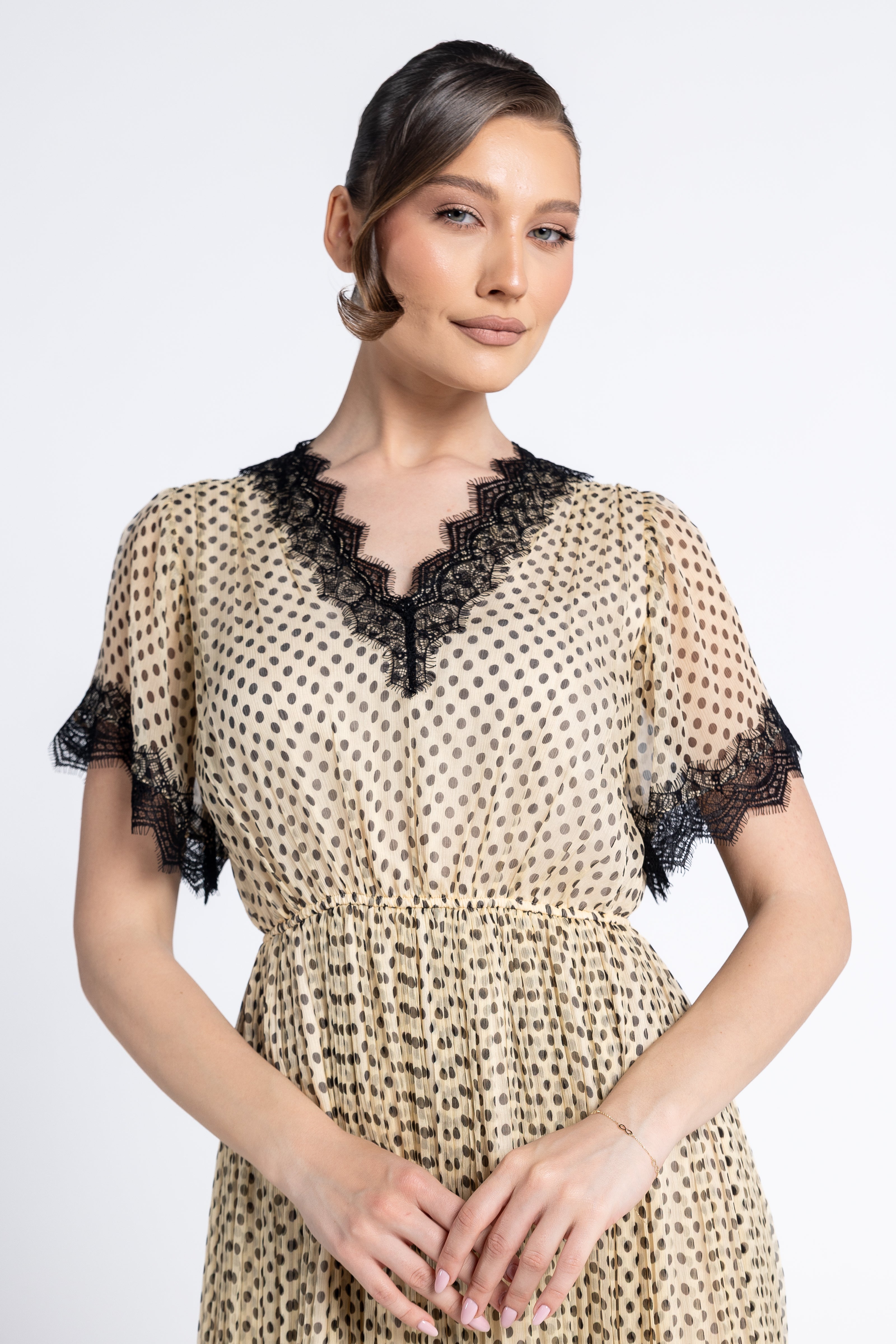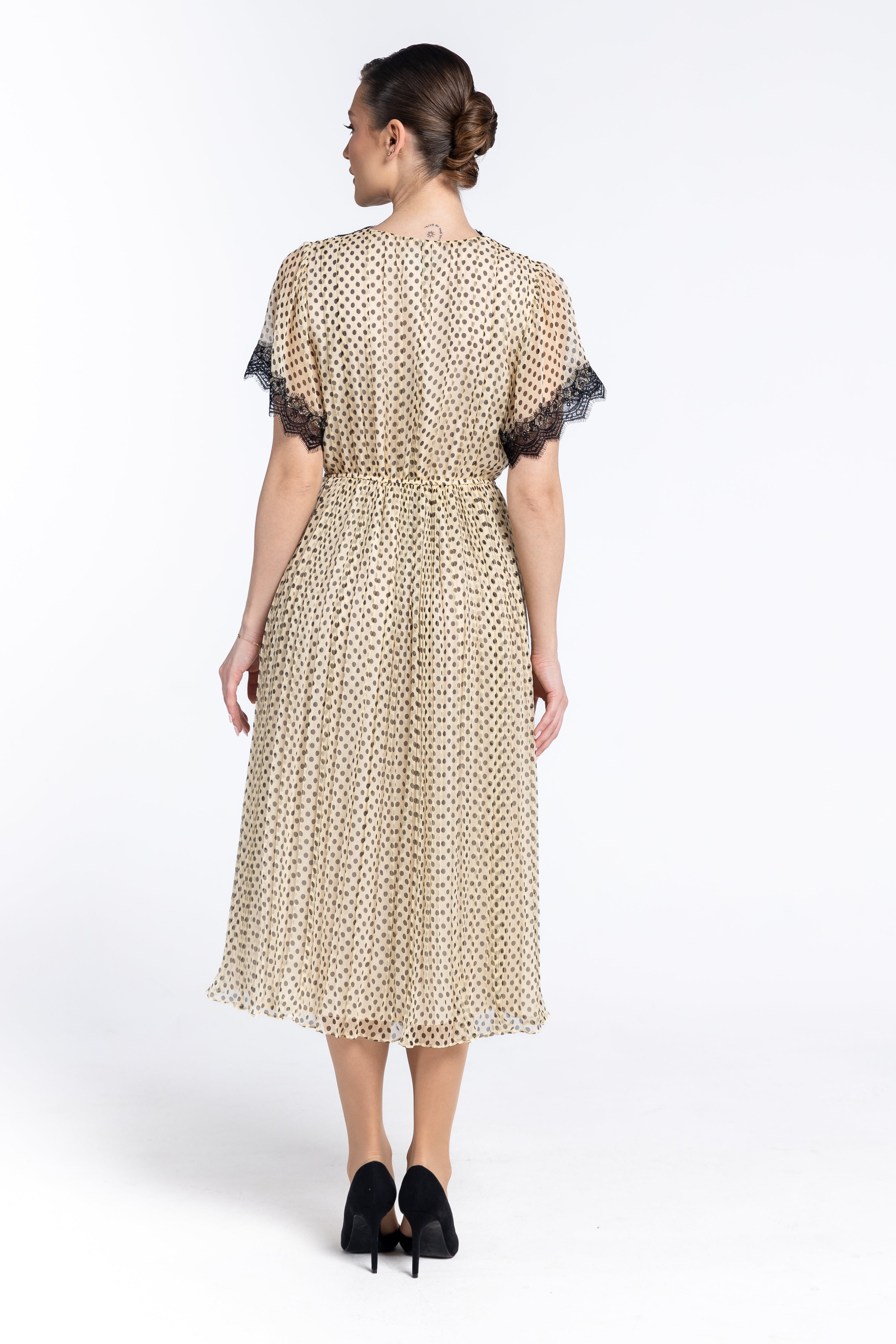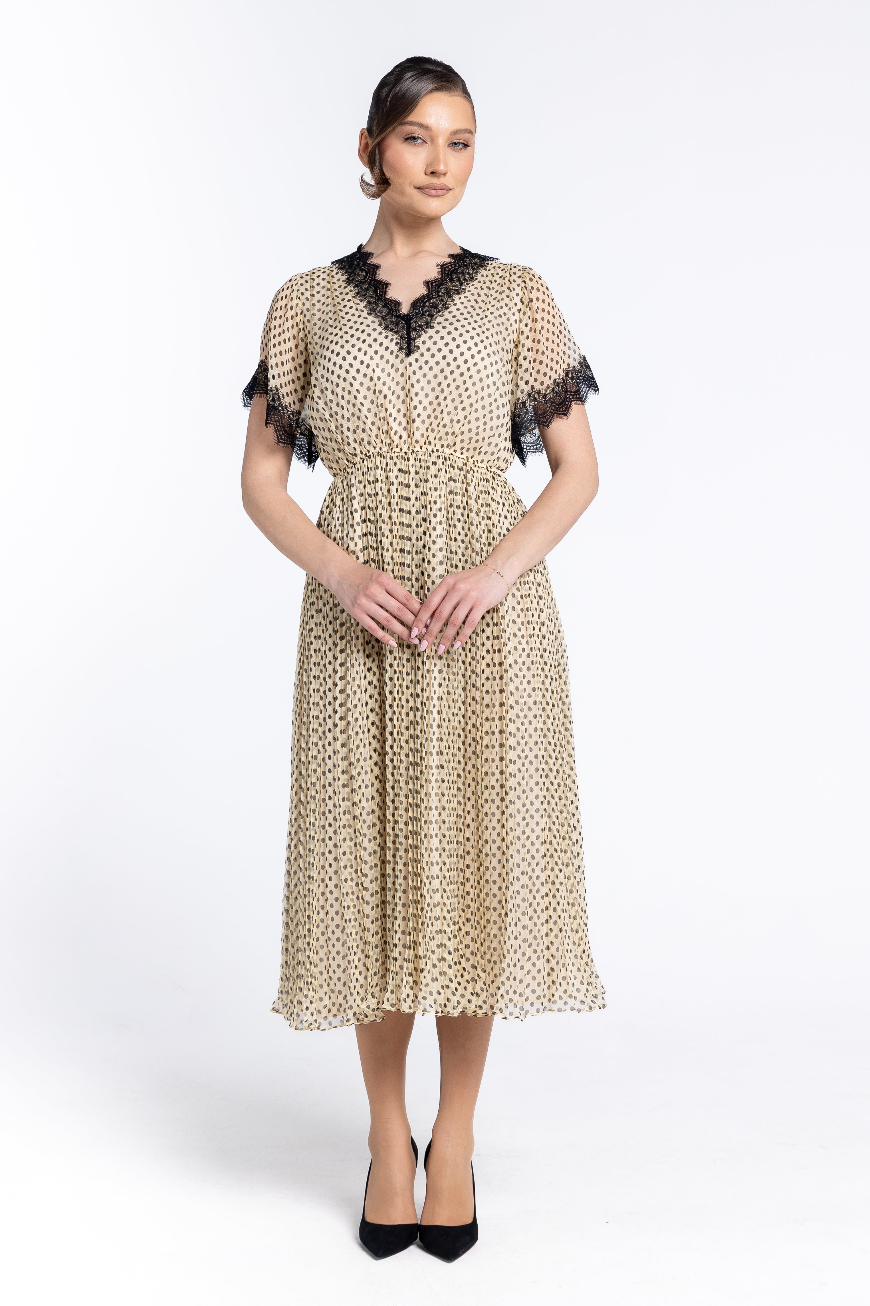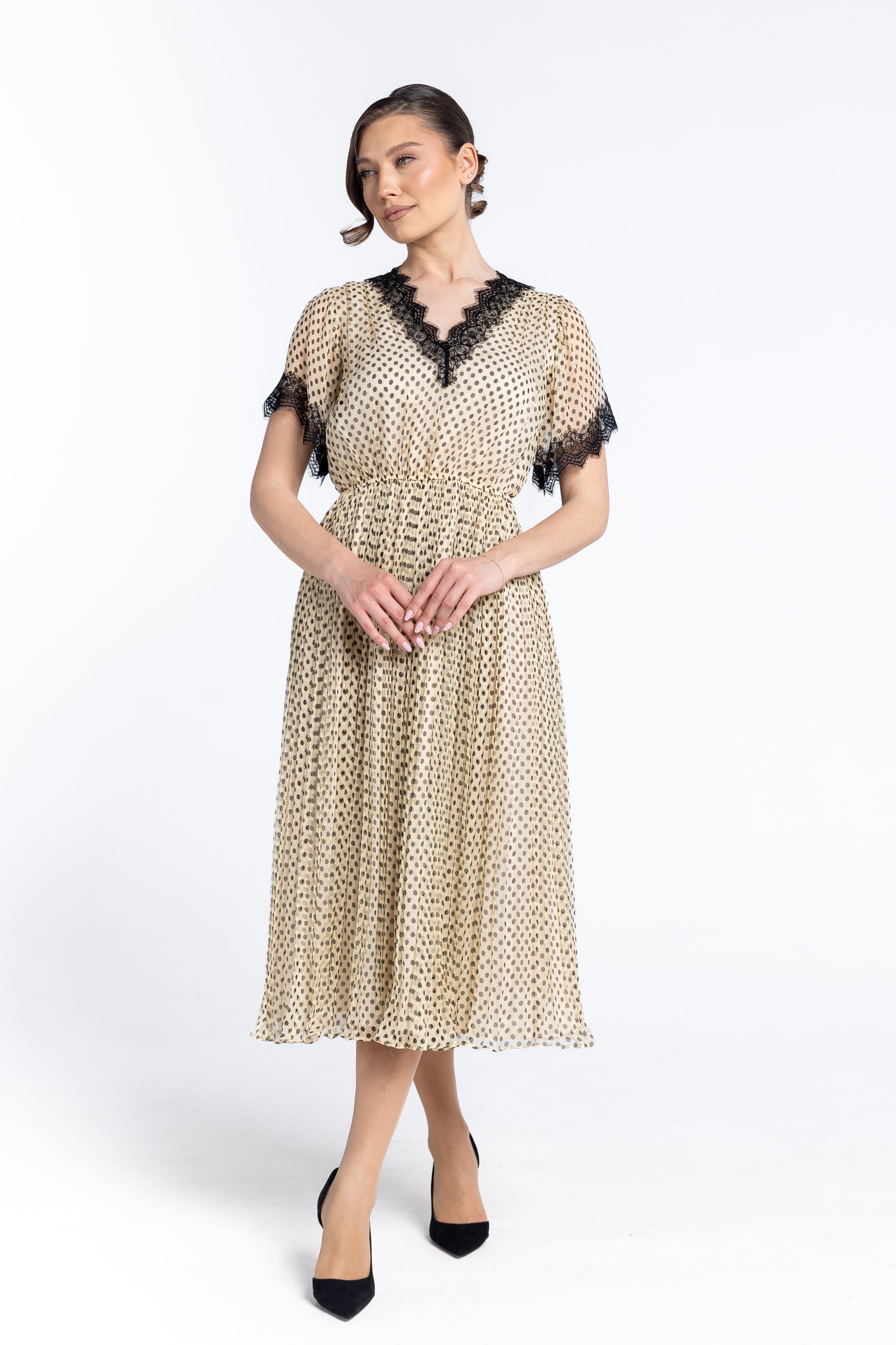Un joc delicat de buline negre pe un fond crem/nude, oferind o estetică versatilă, potrivită atât pentru evenimente de zi, cât și pentru ocazii speciale.